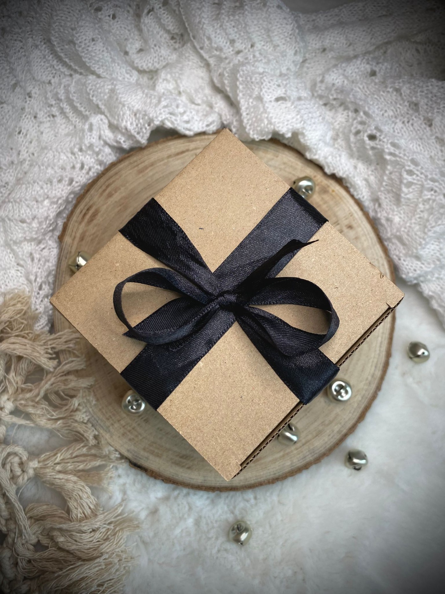 Elegantní dárková krabička zdobená černou saténovou stuhou.