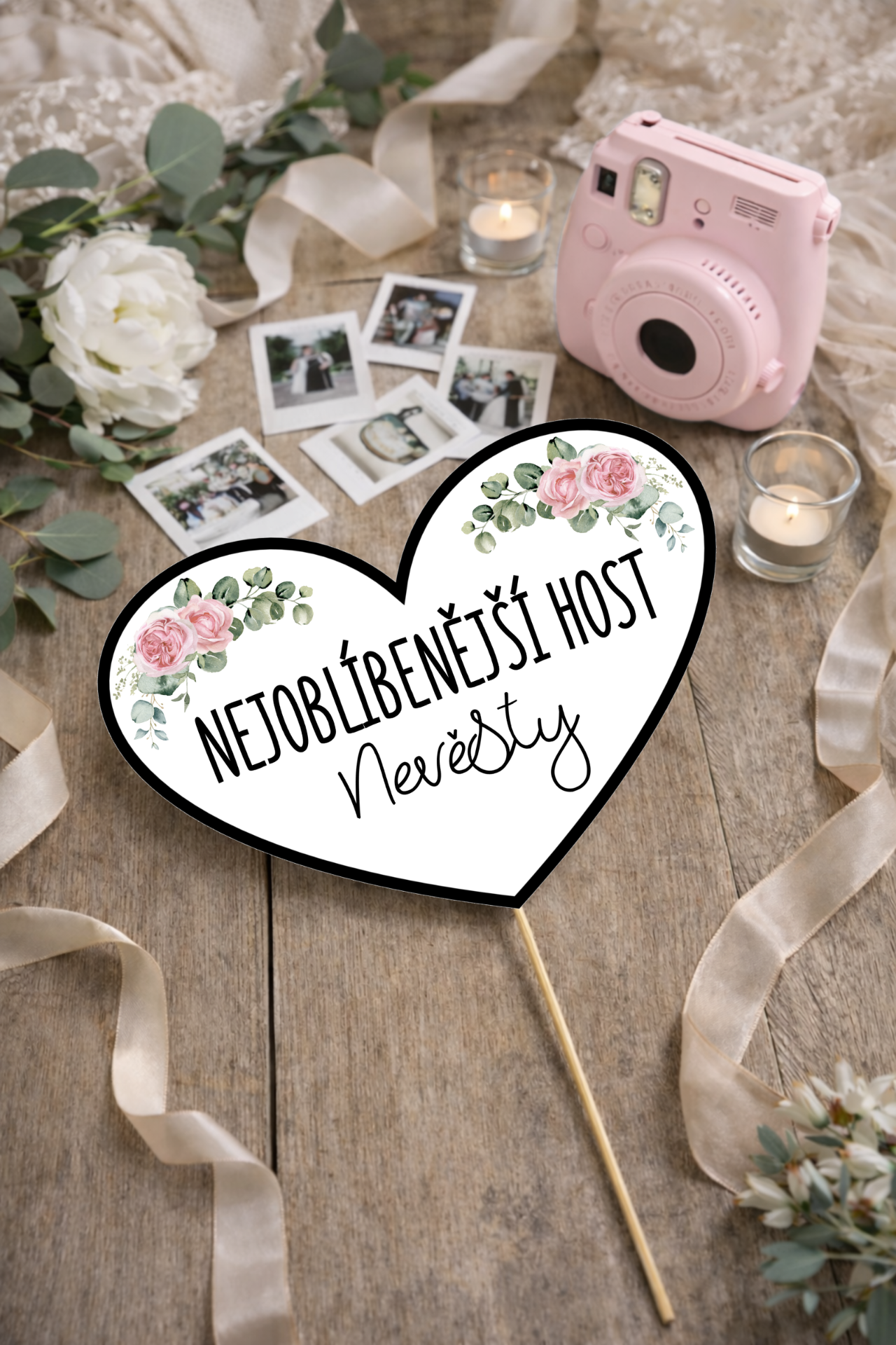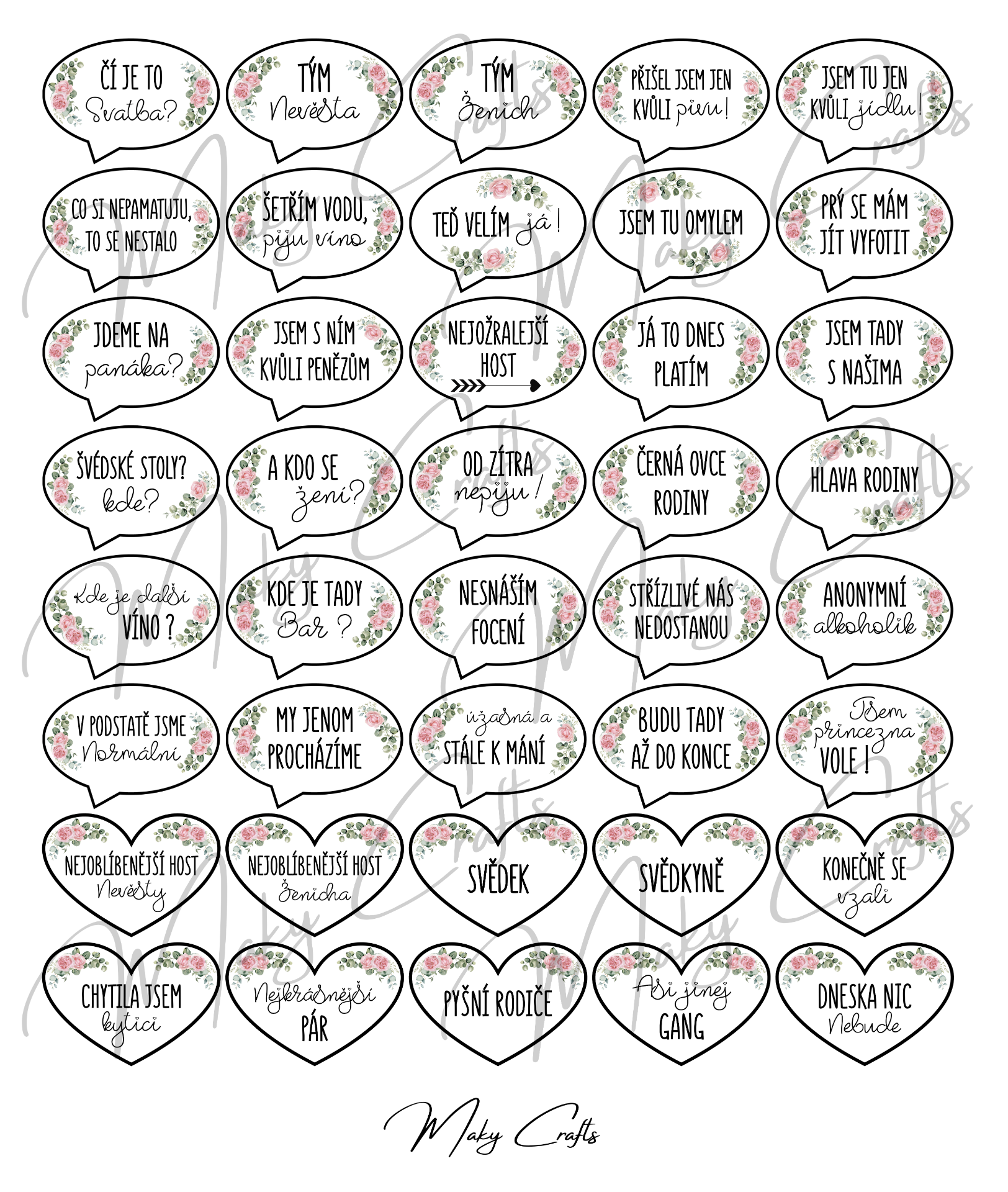 Oživte svůj svatební fotokoutek stylovými rekvizitami s jemným růžovým motivem. Elegantní tvary bublin a srdcí doplňuje mix vtipných a romantických hlášek, které zaručeně pobaví hosty a dodají fotografiím jedinečnou atmosféru.