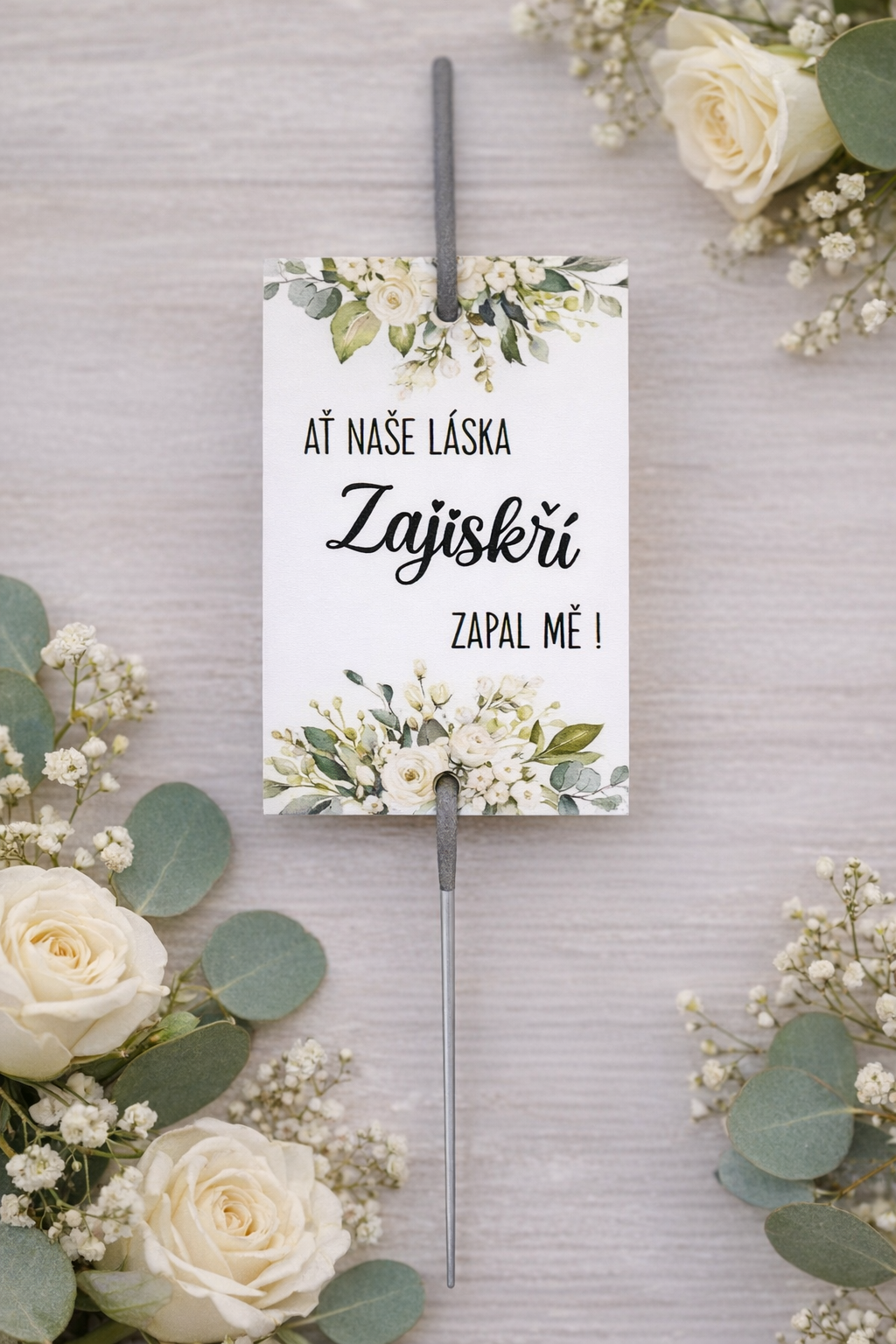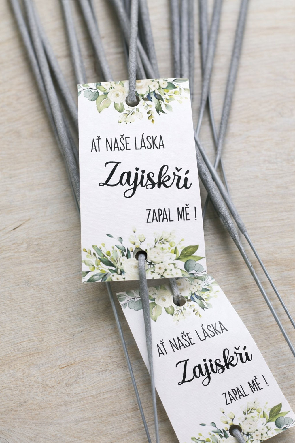 Romantický detail, který rozzáří váš velký den. Elegantní svatební štítek s jemným květinovým motivem a černým písmem je navržený speciálně pro prskavky – stačí ji jednoduše provléknout dvěma připravenými dírkami (jedna nahoře, jedna dole) a máte krásnou a praktickou dekoraci pro večerní svatební atmosféru.