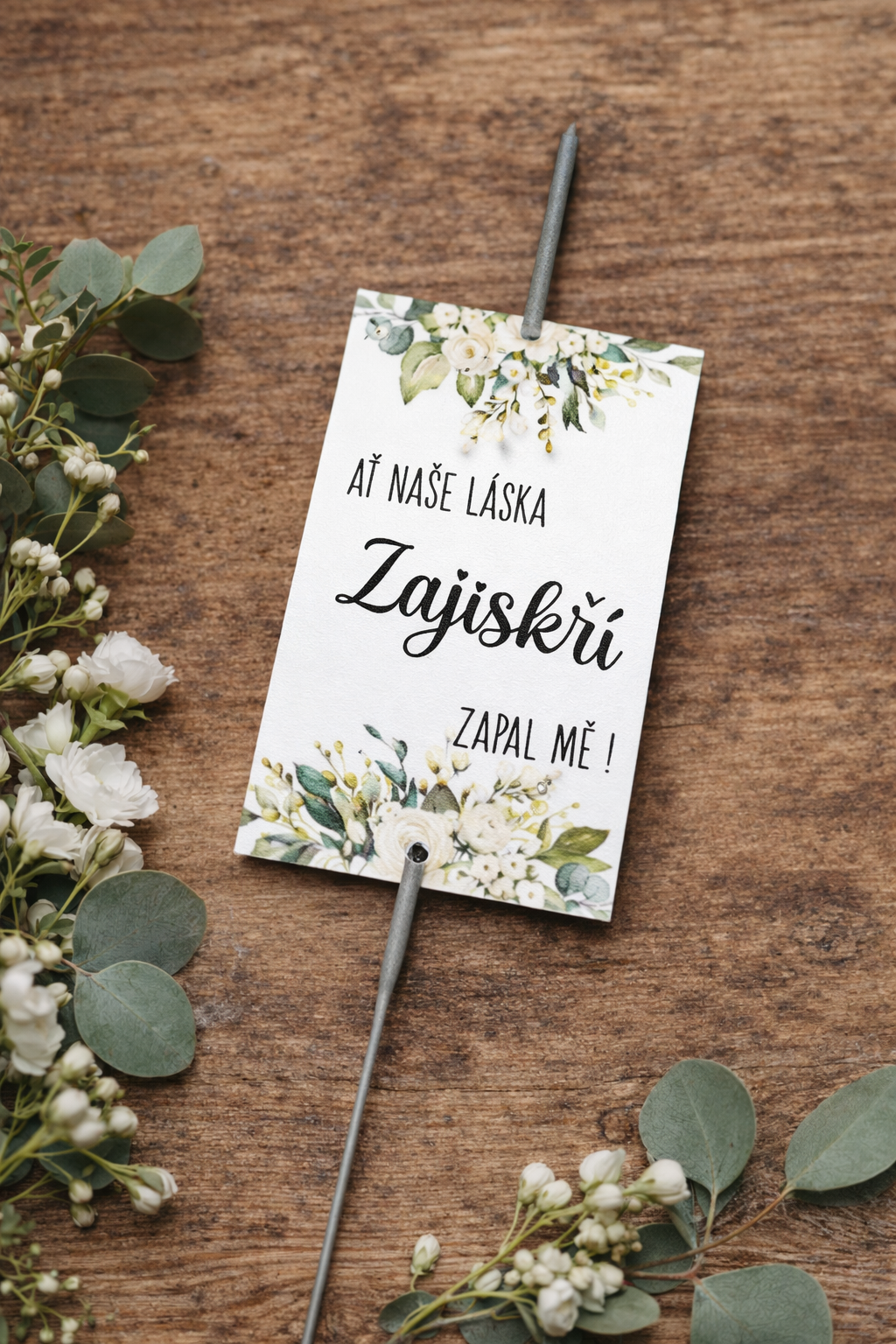Text na kartičce: Ať naše láska zajiskří. Zapal mě!